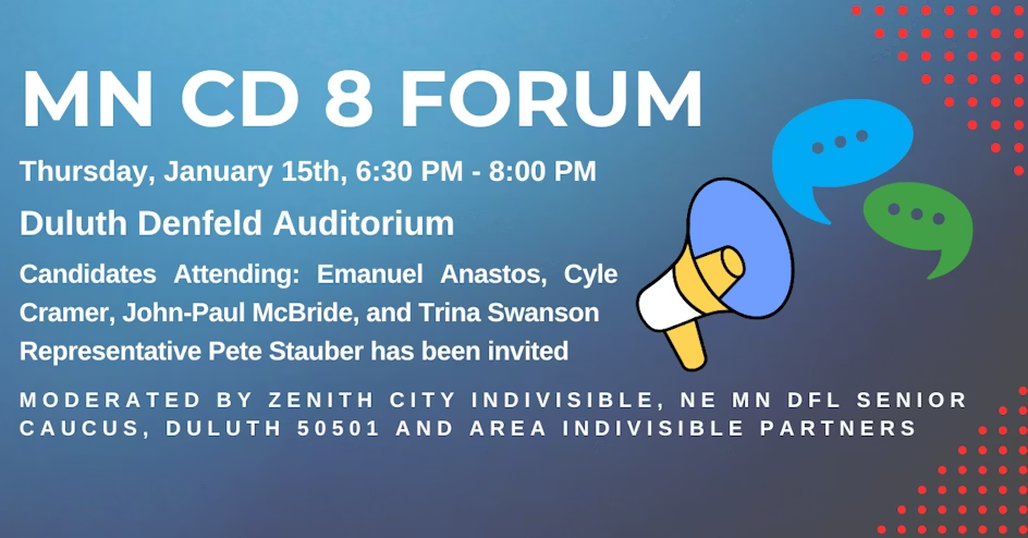 The community is invited to meet candidates who are running for Minnesota's Congressional District 8. The candidates will introduce themselves and respond to questions from participants at the forum.