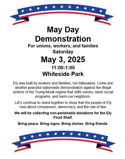 May Day rally celebrating labor, the working class, and families. Working people built Ely and our nation, not billionaires. Support public services for the people including medicare, medicaid, social security, and public education. Support groups and individuals that are under attack.